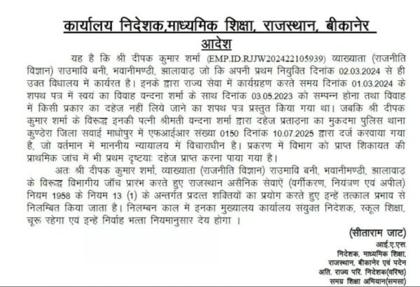 शिक्षा निदेशक माध्यमिक मुख्यालय निदेशालय बीकानेर सीताराम जाट ने जारी किए आदेश के अनुसार झालावाड़ जिले के भवानी मंडी ब्लॉक के बनी गांव में स्थित राजकीय उच्च माध्यमिक विद्यालय में पदस्थापित दीपक कुमार शर्मा ने इस विद्यालय में प्रथम नियुक्ति के तौर पर 2 मार्च 2024 को कार्यभार संभाला था और कार्यभार ग्रहण करते समय 1 मार्च 2024 को दिए गए शपथ पत्र में स्वयं का विवाह वंदना शर्मा के साथ 3 मई 2023 को संपन्न होना बताया था एवं शपथ पत्र में विवाह में किसी प्रकार का दहेज नहीं लिए जाने का शपथ पत्र प्रस्तुत किया गया था।