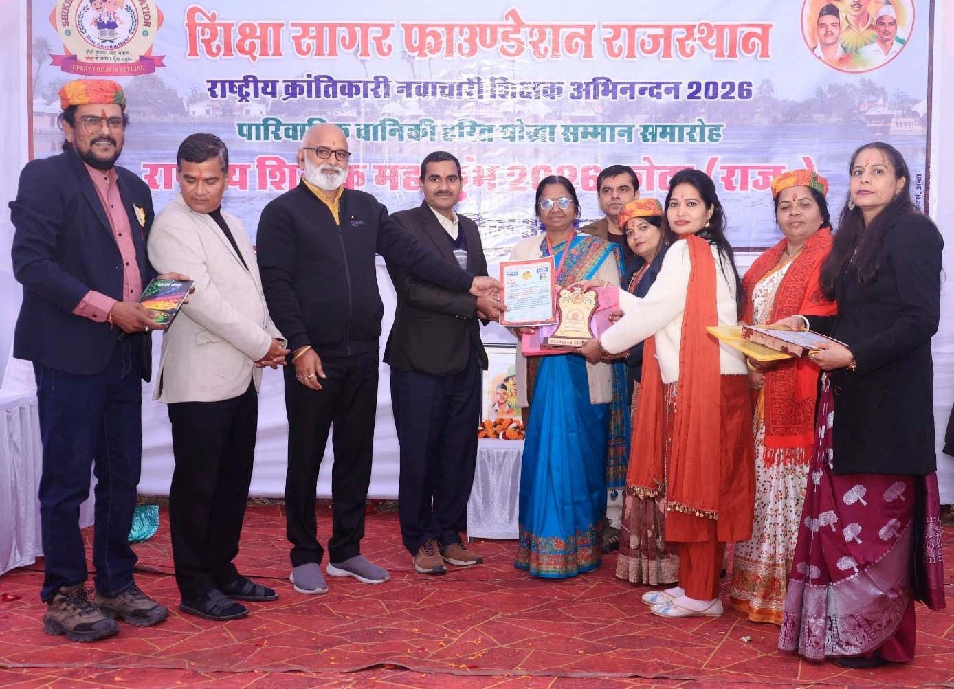 टोंक। जिले के राजकीय उच्च प्राथमिक विधालय सिटी नम्बर 8 में कार्यरत शिक्षिका रेखा जैन को राष्ट्रीय क्रांतिकारी नवाचारी शिक्षक सम्मान दिया गया। शिक्षा सागर फाउंडेशन राजस्थान के तत्वाधान में 4 जनवरी को कोटा के मालव धाकड़ छात्रावास में आयोजित सम्मान समारोह में शिक्षा सागर फाउंडेशन के संस्थापक शैलेश प्रजापति, राष्ट्रीय प्रेरक हरियाणा के सुरेश राणा, राष्ट्रीय प्रेरक छतीसगढ़ की गायत्री मिश्रा, आयोजन संयोजक भुवनेश मालव एवं कोटा जिला शिक्षा अधिकारी रामचरण मीणा ने शिक्षिका रेखा जैन को प्रशस्ति पत्र, मेडल एवं मोमेंटो देकर सम्मानित किया। श्रीमती जैन को यह सम्मान शिक्षा के क्षेत्र में किये गए उत्कृष्ट कार्य एवं नवाचार के लिए प्रदान किया गया। समारोह में देश के विभिन्न प्रान्तों से आये सैकड़ो नवाचारी शिक्षक उपस्तिथ रहे।