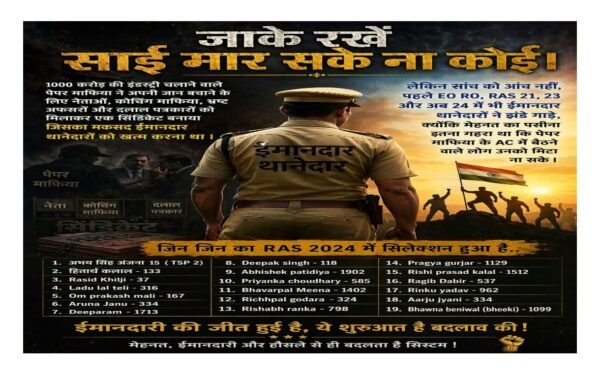 जयपुर / डॉ. चेतन ठठेरा। राजस्थान लोक सेवा आयोग द्वारा आयोजित की गई सब इंस्पेक्टर(SI) भर्ती परीक्षा 2021 विवादों में आने के बाद हाई कोर्ट द्वारा इसको रद्द कर ने के आदेश से कहीं खुशी कहीं गम की स्थिति देखने को मिली लेकिन इस भर्ती परीक्षा में चयनित हुए 19 ट्रेनी एस आई ने निराश होने के बजाय अपनी ईमानदारी का परिचय देते हुए आरएएस(RAS) भर्ती परीक्षा 2024 में चायनित होकर साबित कर दिया है।
